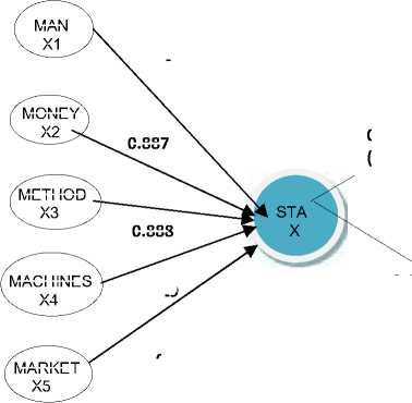 Berdasarkan hasil analisis dengan visual PLS menunjukkan bahwa koefisien parameter jalur yang diperoleh dari hubungan man, money, method, machines, dan market terhadap sub terminal agribisnis di atas 0,50 dengan nilai T-statistik > 2,58 pada taraf signifikan α = 0,1 (10 %), hal ini berarti faktor man, money, method, machines, dan market berpengaruh positip dan sangat nyata terhadap sub terminal agribisnis. Semakin besar pengaruh peranan faktor man,