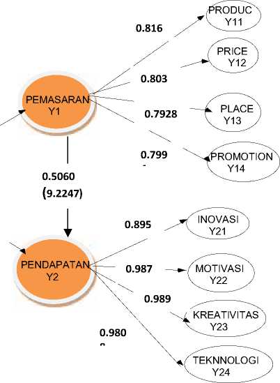 Berdasarkan hasil analisis dengan visual PLS menunjukkan bahwa, koefisien parameter antara sub terminal agribisnis (X1-X5) terhadap kinerja pemasaran (Y1) sebesar 0.982 dengan nilai T-statistik 281,4825 > 2,58 taraf signifikan α = 0,1 (10 %). Hal ini berarti terdapat pengaruh positip dan sangat nyata antara sub terminal agribisnis dan kinerja pemasaran, semakin tinggi pengaruh sub terminal agribisnis maka semakin besar pula pengaruhnya terhadap perbaikan kinerja pemasaran.