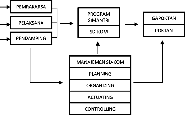 Berdasarkan hasil kajian penelitian ini, manajemen sumberdaya komunikasi penyuluhan Program Simantri digambarkan sebagai bagian dari suatu rangkaian proses kerja yang berawal dari pemrakarsa (pemprov) melahirkan program (Program Simantri) yang digelontorkan kepada gapoktan (Poktan) untuk dilaksanakan guna meningkatkan kesejahteraan petani (seperti terlihat pada Gambar 1).