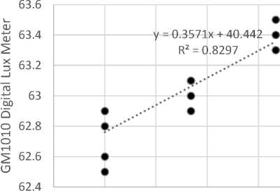 Pengukuran intensitas cahaya sensor BH1750 yang dibandingkan dengan GM1010 Digital Lux Meter, diperoleh koefisien determinasi 0,82 seperti grafik pada Gambar 16 dengan Adjusted R juga sebesar 0,82.