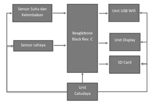 Berikut merupakan blok diagram rancangan fungsional dari alat pemantau suhu, kelembaban dan intensitas cahaya secara wireless pada greenhouse, yang terdiri dari unit sensor, unit BBB, unit USB Wifi, unit Liquid Crystal Display (LCD), unit SD Card dan unit Power Supply.