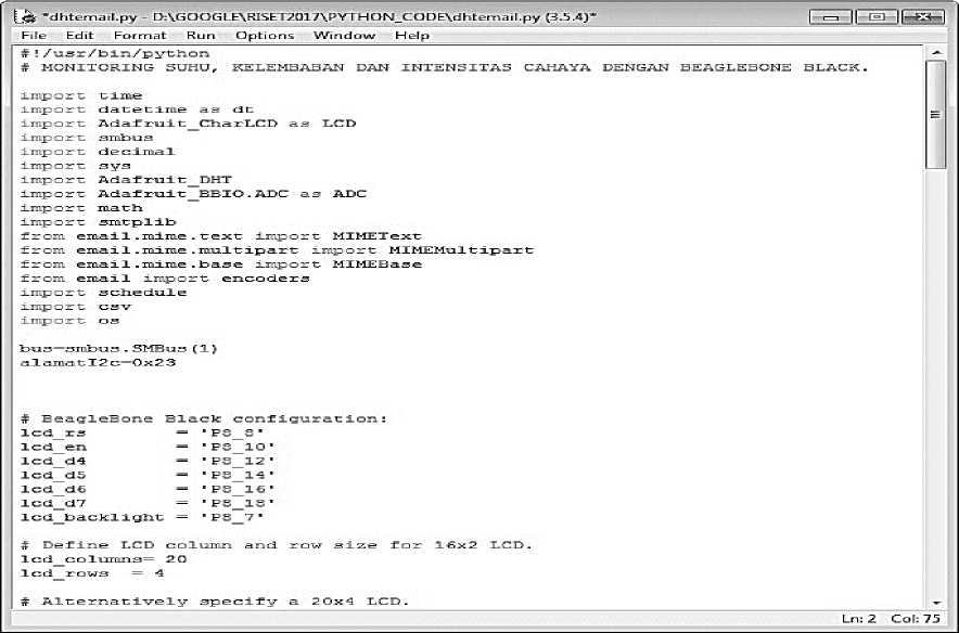 Perangkat Lunak (Software) Beaglebone Black Semua rangkaian elektronik alat pemantau agar dapat berfungsi dibutuhkan suatu perangkat lunak yang disimpan di EMMC (Embedded Multi-Media Controller) atau memory internal BBB. Pada penelitian ini perangkat lunak diprogram dengan menggunakan bahasa pemrograman Python dengan tampilan seperti Gambar 4