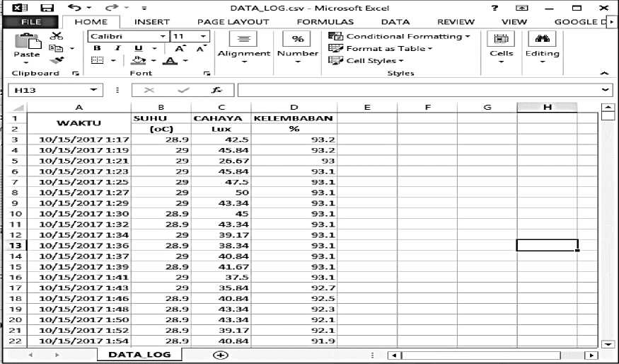 3. Pada pengujian modul sd card, data suhu, kelembaban dan intenitas cahaya berhasil disimpan pada sd card dengan format CSV.