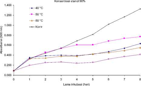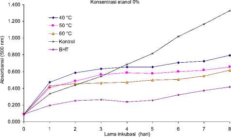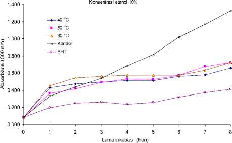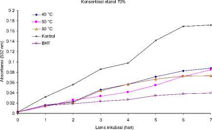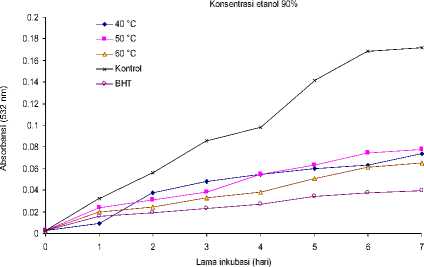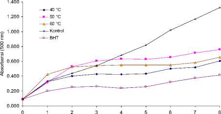 Pada Gambar 8 merupakan aktivitas antioksidan dengan perbedaan konsentrasi yang secara berturut-turut adalah konsentrasi 0%, 10%, 30%, 50%, 70% dan 90%. Berdasarkan grafik terlihat bahwa hasil pengamatan inkubasi pada kontrol (tidak diberi ekstrak kunyit) tertinggi, semakin lama semakin mengalami peningkatan. Hal ini berarti oksidasi asam lemak terus terjadi peningkatan sampai hari ke 8.Kemampuan BHT (antoksidan sintetik) untuk menurunkan oksidasi asam lemak sangat besar sehingga terlihat paling rendah dari perlakuan yang lainnya. Gambar 8 menunjukkan bahwa pada konsentrasi 50 oC dengan suhu 60 oC hampir