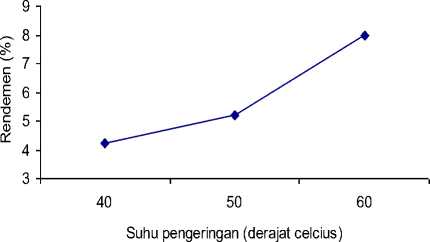 Hasil analisis sidik ragam menunjukkan bahwa perlakuan suhu pengeringan berpengaruh sangat nyata (P<0,01)dan konsentrasi berpengaruh tidak nyata (P>0,05) terhadap rendemen ekstrak kunyit. Interaksi yang terjadi pada kedua perlakuan tersebut dapat dilihat pada pada Tabel 1.