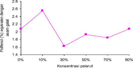menit menunjukkan tidak berpengaruh terhadap penangkap radikal, namun pemanasan selama 60 menit pada kondisi sama aktivitas antioksidan menurun. Rerata perlakuan konsentrasi pelarut menunjukkan nilai DPPH tertinggi diperoleh dari perlakuan konsentrasi pelarut 70%. Kondisi ini menunjukkan bahwa aktivitas antiradikal tidak dipengaruhi oleh jumlah senyawa polifenol yang terkandung. Jumlah polifenol tinggi tidak otomatis mempunyai aktifitas antiradikal yang tinggi pula.