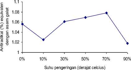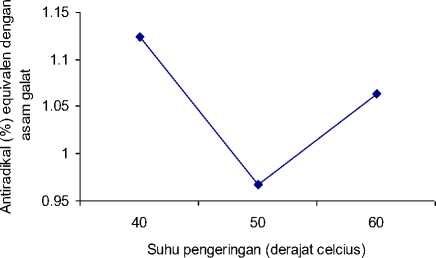 Kemampuan menangkap radikal bebas merupakan istilah lain untuk aktivitas antiradikal suatu senyawa, aktivitas ini diukur dengan nilai DPPH. Berdasarkan Tabel 3 rerata aktivitas antiradikal tertinggi terdapat pada suhu 40 oC. Data ini menunjukkan bahwa pada suhu pengeringan rendah senyawa polifenol yang