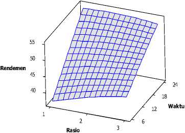 Model linier disajikan menggunakan permukaan respon (plot tiga dimensi) dan kontur optimasi. Grafik permukaan respon (tiga dimensi) dan kontur optimasi dapat dilihat pada gambar 1. Plot tiga dimensi diperoleh dari memplotkan respon persen rendemen concrete kulit & pulp jeruk kalamansi pada sumbu Y terhadap X (rasio bahan dan pelarut, dan waktu). Setiap plot menunjukkan
