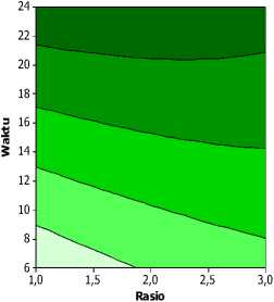 Dari bentuk kontur dapat diketahui bahwa titik optimum belum dicapai. Nilai maksimum rendemen concrete sebesar 54, 68 % dihasilkan pada rasio bahan dan pelarut 1:1,75 dan lama maserasi 24 jam. Titik optimum kemungkinan besar dapat dicapai jika rasio bahan dan pelarut serta lama maserasi ditingkatkan.