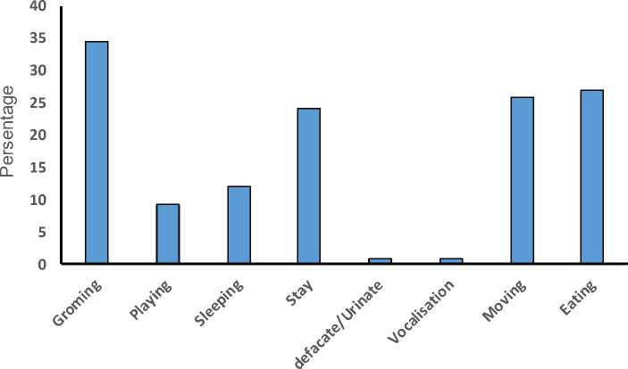 24% for stay (no displacement) (Figure 1). They used their time for sleeping and playing for about 12% and 10% respectively. They hardly found making noice (vocalisation) and defacate or urinate.