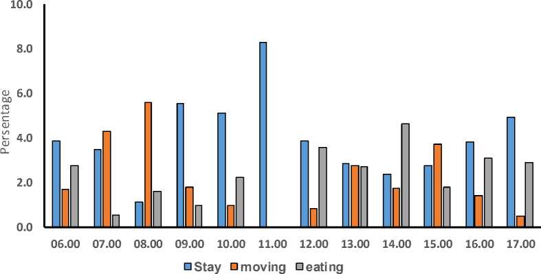activity of stay with the eye closed; stay (stationary) was defined as no displacement was made; vocalisation defined as any sound was made; eating was defined as any activities from taking and chewing food. Data collected are presented proporsionally of each activities and time.