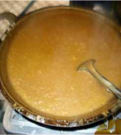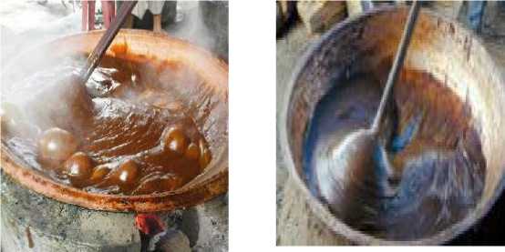 Dengan komposisi tersebut, karakteristik dodol yang dihasilkan memiliki aroma yang khas yaitu dodol dengan aroma nangka. Permukaan dodol yang mengkilap disebabkan oleh adanya pencampuran margarin yang mengandung lemak sehingga menimbulkan kelengketan pada dodol nangka. Proses pemasakan dodol nangka dimulai dari pemasakan 0 jam hingga 2 jam dapat dilihat pada Gambar 1. ; Gambar 2. ; Gambar 3.