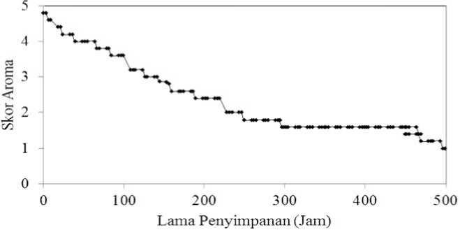 Gambar 7. Grafik hubungan antara skor uji aroma dan lama penyimpanan.