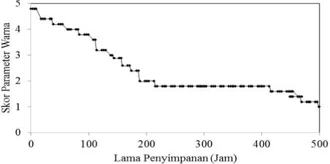 Nilai rata-rata tertinggi hasil uji organoleptik terhadap warna yaitu 4.8 dengan kriteria (cokelat tua dan berminyak) pada penyimpanan 0 jam, untuk skor rata-rata 4 dengan kriteria (cokelat berminyak) pada penyimpanan 63 jam, skor rata-rata 3 dengan kriteria (cokelat tanpa minyak) pada penyimpanan 138 jam, skor rata-rata 2 (cokelat muda tanpa) pada penyimpanan 189 jam, sedangkan skor terendah yaitu 1 (cokelat pudar berkapang) diperoleh pada penyimpanan selama 499 jam atau 115 hari, standar deviasi skor rata-rata uji organoleptik parameter warna sebesar 1.0567.