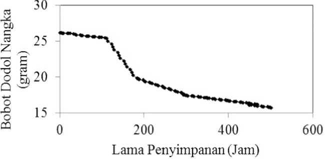 Grafik perubahan bobot dodol nangka menunjukkan bahwa pada penyimpanan 0 hingga 111 jam bobot nangka mengalami penurunan yang cukup stabil, penurunan tertinggi bobot dodol nangka terjadi pada lama penyimpanan 114 jam. Nilai bobot dodol nangka pada penyimpanan 111 jam sebesar 25.158 gram, sedangkan nilai bobot dodol nangka pada penyimpan 114 jam sebesar 24.933 gram. Selanjutnya penurunan bobot dodol nangka terus terjadi hingga mencapai bobot terendah pada penyimpanan 501 jam dengan nilai bobot sebesar 15.886 gram. Visualisasi perubahan bobot dodol nangka selama penyimpanan dapat dilihat pada Gmbar 4.