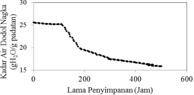 Kadar air awal dodol nangka berdasarkan hasil pengukuran dengan metode oven diperoleh nilai kadar air sebesar 0.226401 gH2O/g padatan. Nilai ini sesuai dengan SNI No. 01-2986-1992, dimana dalam SNI tersebut syarat mutu dari dodol nangka adalah memiliki kadar air basis kering maksimal 0.2500 gH2O/g padatan (BSN, 2006). Hasil kadar air awal basis kering pada dodol nangka juga mendekati hasil penghitungan kadar air produk semi basah yang dilakukan oleh Adnan (2000), penurunan mutu pada produk semi basah berkaitan erat dengan perubahan nilai kadar air produk, kadar air produk semi basah memiliki kisaran nilai 10-25 % basis kering dengan mikroorganisme yang tumbuh pada produk tersebut adalah kapang.