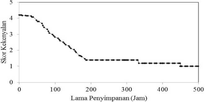 Dari hasil grafik pada Gambar 6. dapat diketahui bahwa semakin lama dodol nangka disimpan maka skor tekstur kekenyalannya akan semakin menurun. Hal ini sesuai dengan penelitian Muchtadi dan Sugiono (1998), pada umumnya kerusakan utama yang terjadi pada sebagian besar produk pangan semi basah terletak pada perubahan tekstur yang terjadi selama penyimpanannya.