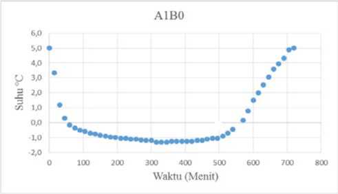 Berdasarkan hasil nilai rata - rata lama waktu sistem rantai dingin didapatkan hasil bahwa perlakuan penambahan garam dan perbandingan media mampu memberikan pengaruh yang sangat baik terhadap lama waktu sistem rantai dingin ikan tongkol (Euthynnus affini). Berdasarkan lama waktu sistem rantai dingin pada Gambar 1 dan Tabel 1 didapatkan hasil bahwa lama waktu sistem rantai dingin yang paling lama mencapai suhu maksimal 5°C yaitu pada perlakuan A1B0 (media es dengan garam 10% dan perbandingan 1:1) dengan waktu 11 jam 51 menit.