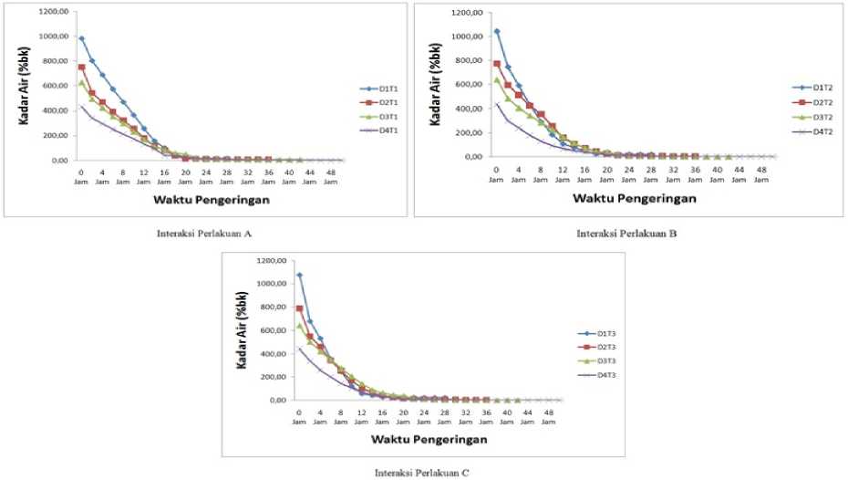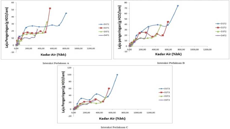 Gambar 1. dapat dilihat hubungan antara laju pengeringan terhadap kadar air menggunakan kombinasi dektrin dan tween 80. Pada interaksi perlakuan dekstrin D1 (10%) dengan tween 80 T3 (0.5%) terlihat laju pengeringannya lebih tinggi dibandingkan dengan interaksi perlakuan dekstrin D2 (14%), interaksi perlakuan dekstrin D3 (18%), dan interaksi perlakuan D4 (22%) dengan tween 80 T1 (0.3%), T2 (0.4%), dan T3 (0.5). Semakin tinggi konsentrasi dekstrin yang digunakan maka laju pengeringan akan semakin