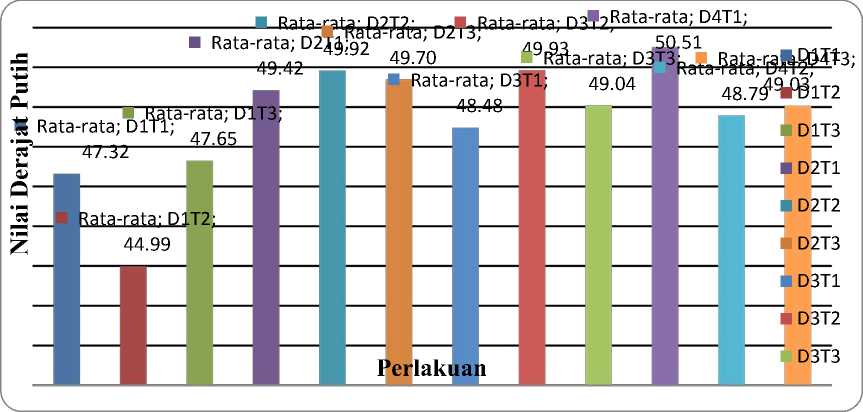 Gambar 3. terlihat derajat warna putih tepung lidah buaya yang terendah adalah dari interaksi perlakuan D1 (10%) T2 (0.4%) sebesar 44.99 dan derajat warna putih yang tertinggi adalah dari interaksi perlakuan D4 (22%) T1 (0.3%) sebesar 50.51.