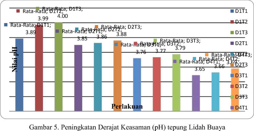 Gambar 5. menunjukkan nilai pH tertinggi adalah dari kombinasi perlakuan D1 (10%) T3 (0.5%) sebesar 4.00 dan terendah adalah dari kombinasi perlakuan D4 (22%) T1 (0.3%) sebesar 3,65. Nilai pH dari tepung lidah buaya mengalami penurunan dengan bertambahnya konsentrasi dekstrin yang digunakan. Menurut Reynold (1982), dekstrin merupakan polisakarida yang dihasilkan dari hidrolisis pati yang diatur oleh enzim-enzim tertentu atau hidrolisis oleh asam. Oleh karena itu semakin tinggi konsentrasi dekstrin yang digunakan maka asam akan semakin banyak yang menyebabkan nilai pH tepung lidah buaya akan semakin menurun. Namun dengan bertambahnya konsentrasi tween 80 yang digunakan, pH