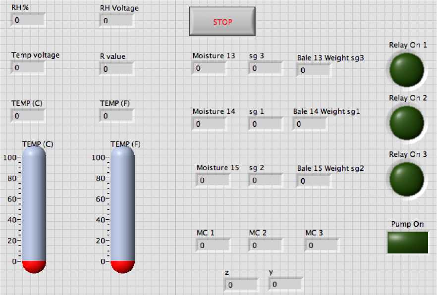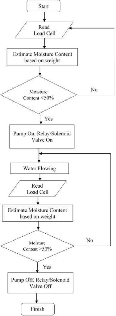 The major goal of this project was to do a test run of the full-scale project using only three bales. The moisture content was to be maintained above 50%, which was monitored using load cells to determine the weight. Before the experiment begins, the bales are soaked for about 24 hours to obtain an initial moisture content of approximately 55%. It was assumed that the moisture was evenly distributed throughout the bale, so the weight would be a good indicator of the moisture content. If the moisture content drops below 50%, the LabVIEW program that was developed would send a signal to a relay to turn on the pump and solenoid valve to add water automatically (Figure 1).