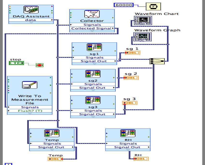 There are two components of the VI (virtual instrument) on the LabView: the front panel and the block diagram. The front panel, shown in Figure 9, has several indicators (readings, relays, graphs, etc). The block diagram for this program contains three while loops. The first loop (Figure 10) shows the DAQ Assistant, which reads the voltage signals from the strain gauges, temperature and relative humidity sensor, and thermocouples. The sampling rate was determined by a “ms to wait” control, with 1 sample per minute. Signal manipulation was used to split the signal from the DAQ Assistant, so that individual signals can be analyzed differently. The strain gauge signals were also merged together so they can be