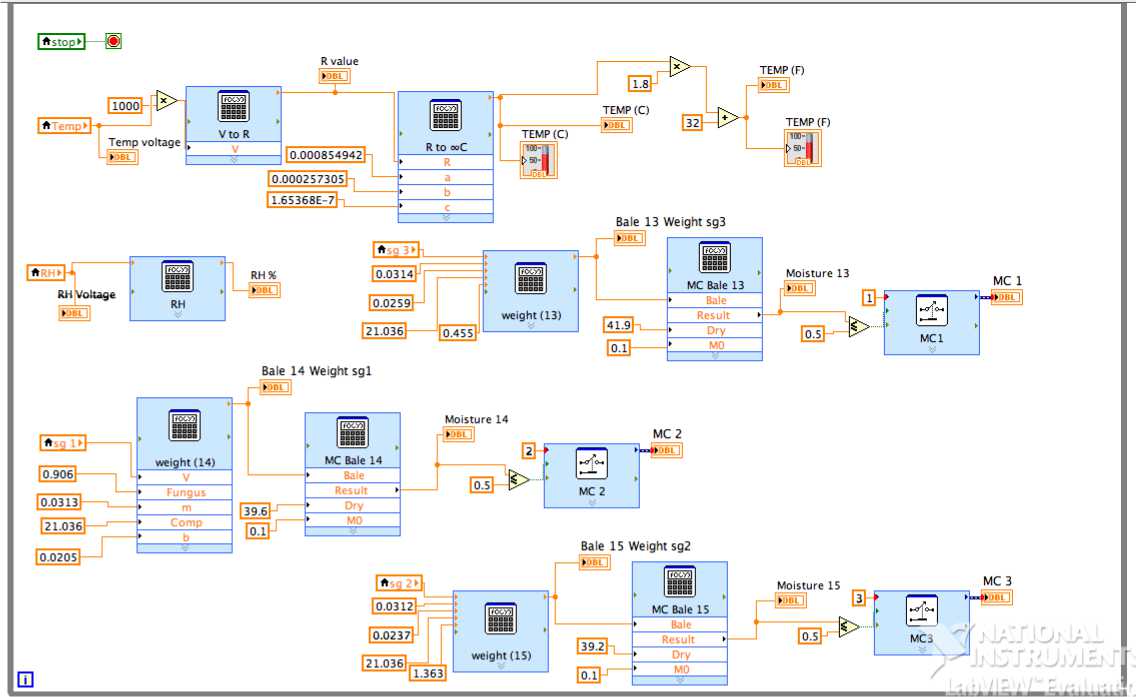 The second loop (Figure 11) shows the formulas to calculate weight, moisture content, temperature, and relative humidity from the voltage readings. Each bale also has a relay connected to a comparison function. If the calculated moisture content is below 0.5 (50%), the relay outputs a value corresponding to the bale number. This number (e.g. MC1) is transferred to the next loop using a local variable.
