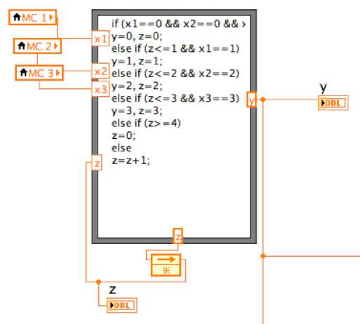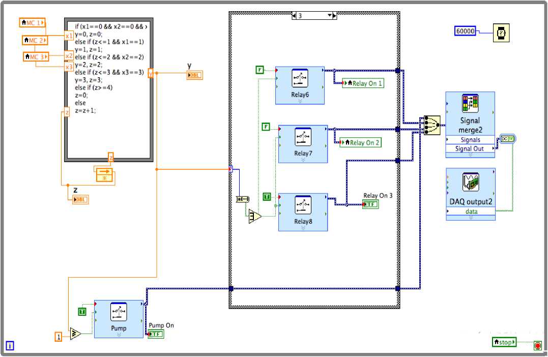 The third loop (Figure 12) has a formula node and a case selector that is used for relay output selection. The formula node (Figure 13) inputs, x1, x2, and x3, correspond to the MC value of each strain gauge. Y is the output, which goes to the case selector, and z indicates the order. If z is less than x, then y becomes the value of x; if not, it must continue to read through the loop, and z=z+1. Once z = 4, z becomes 0 and the loop starts over. The case selector has 4 cases; case 0 indicates that everything is off. When y equal to 1, relay number 1 is on, the pump is on, and relay number 2 and 3 are off. The relays output a True value if on (5V digital) and False if off (0V digital). The relay output signals from the case selector merge