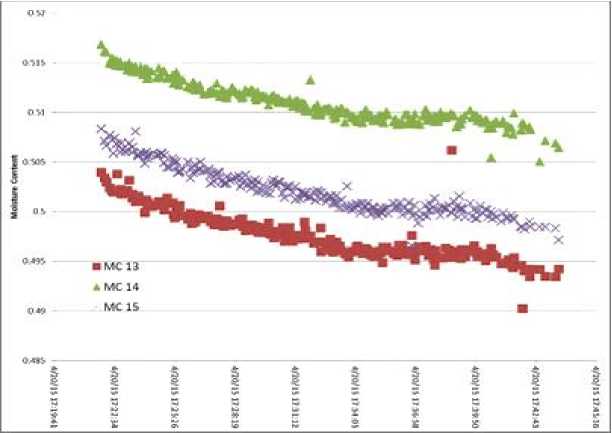 This system has been set up for almost three weeks, and fungal growth has been observed on the outside of the bales. This indicates that the moisture is staying within the acceptable range. The strain gauges are reading the weights and the temperature and relative humidity have remained steady. Figure 14 shows one graph generated from the strain gauge data. However, there were some issues related to instability of data logger reading. The reading was stable at the pins of the amplifier when using digital multimeter. This issue possibly can be resolve by adding low pass or high pass filter depends on the