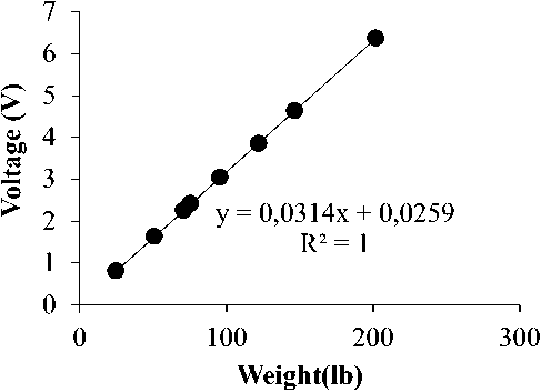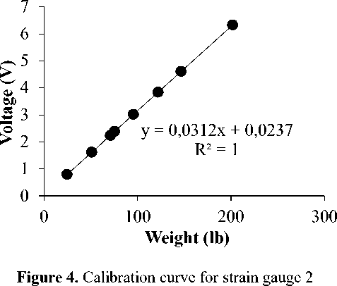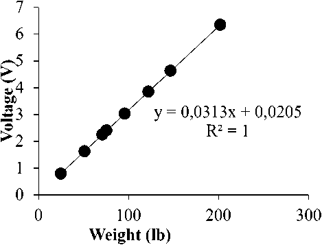 Tacuna Systems AmCells STL-200 S-Type Alloy Steel load cells with maximum load of 200 pounds were used. Three strain gauges were calibrated using eight combinations of weight, ranging from 24.7 to 202 lb. The voltage was adjusted to compensate for the large metal hook used to hold the weights onto the strain gauge and was calculated by subtracting the voltage reading with the just the hook from the voltage reading with the weight. All the calibration curves showed the linear relationship between voltage and weight with the strength of the regression model, R2 =1 (Figure 3, Figure 4, and Figure 5).