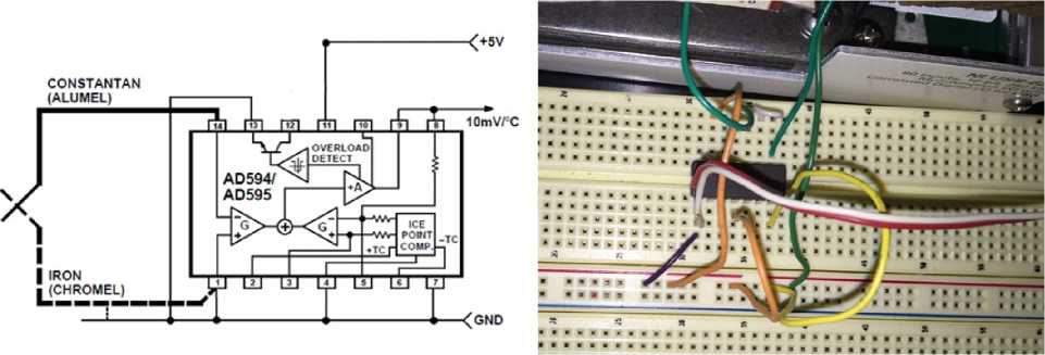 J-type thermocouples were used to measure the temperature inside the bales. Each bale has four thermocouple wires. Because of the limitations of analog input of the data logger and the number of thermocouples needed, the differential wiring to provide cold junction compensation cannot be done. Instead, Monolithic Thermocouple Amplifiers with Cold Junction Compensation (AD594) was used to allow the thermocouples to be measured relative to the ground. The output of these thermocouple amplifiers is 10 mV∕°C.