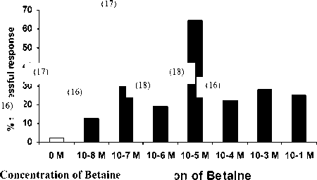 The response of seastars to molar concentration of betaine solution is presented in Fig.1. The responses resulted in a bell-shaped graph with 10-5 M producing the maximum response. The proportion of successful seastars increased from 2.44 % ; in the control to a peak of 58.82% in 10-5M but changed only slightly from 10-4 to 10- 1.