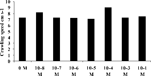 Crawling speed and NGDR of A. amurensis in response to these betaine concentrations are presented in Figs 3 and 4. Statistical analysis by means of two tailed t-tests (unequal replication) indicated that the crawling speed was not significantly different between concentrations (P > 0.05) except between 10-5 and 10-4 M. There was also non significantly different NGDRs at these concentrations (P > 0.05).