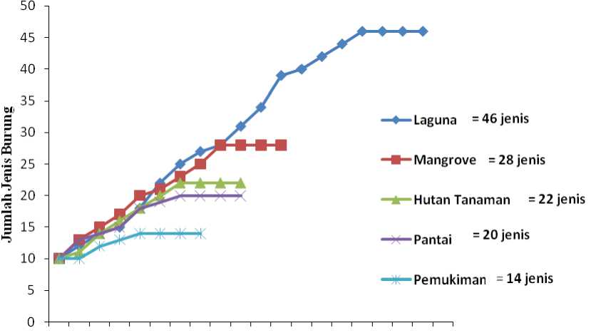 Berdasarkan lima tipe habitat jumlah jenis burung yang paling banyak ditemukan di habitat laguna yaitu 46 jenis burung dan yang terendah ada di pemukiman dengan 14 jenis burung
