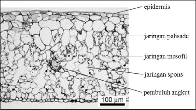 Gambar 3. Penampang melintang lamina daun N. alata dengan jaringan palisade dan spons (Pavlovič et al., 2007)