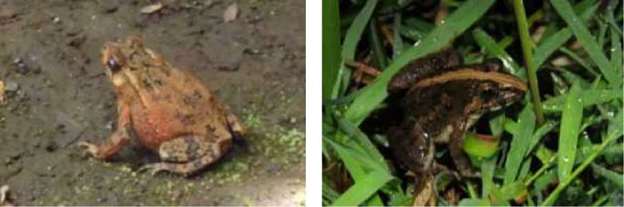 Gambar 2. Jenis kodok dan katak yang paling melimpah di SM Paliyan (a) kodok puru hutan (Ingerophrynus biporcatus); dan (b) katak tegalan (Fejervarya limnocharis).