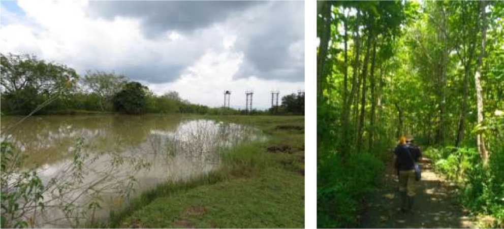 Gambar 3. Habitat kodok dan katak (Anura) di SM Paliyan (a) Petak 137 berupa danau dengan vegetasi riparian di satu sisi dan rerumputan di sisi seberangnya; dan (b) Petak 138 merupakan area hutan lebat dengan pepohonan tinggi dan kanopi rapat, tetapi tanpa genangan air.