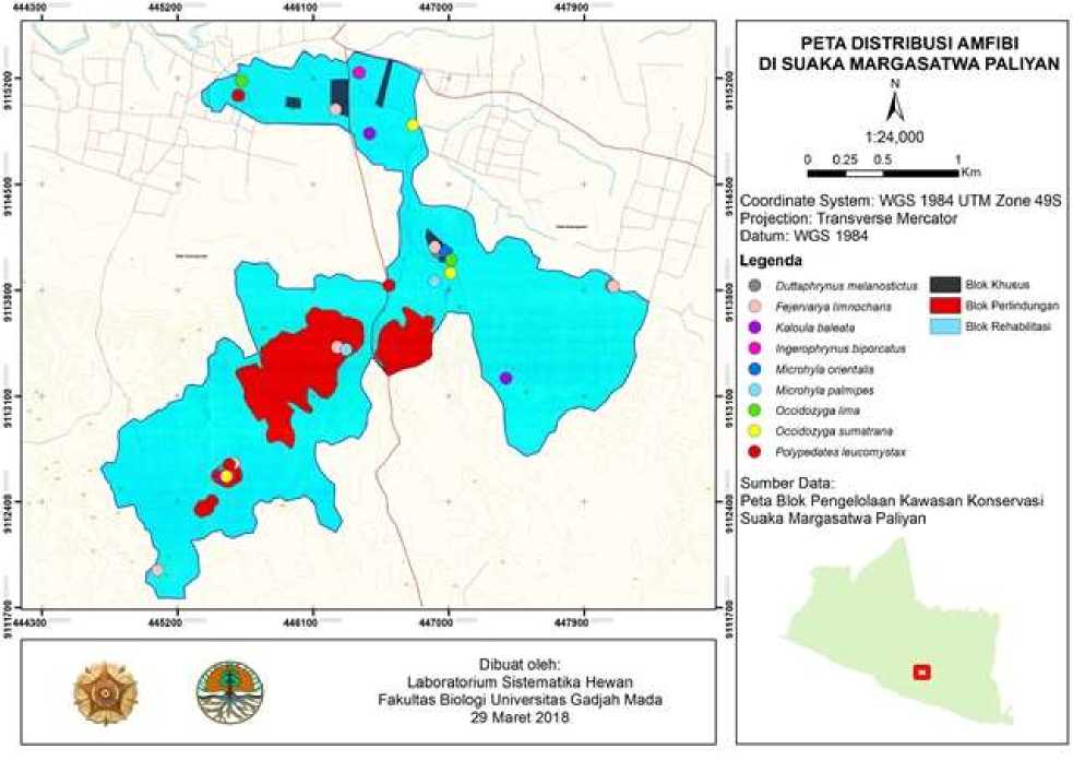 Amfibi yang dijumpai di SM Paliyan cenderung mengumpul pada suatu titik tertentu (Gambar 4). Amfibi banyak dijumpai di area dengan adanya genangan air, baik kolam, sungai kecil dan telaga. Selain itu, mereka dijumpai diantara pepohonan dan semak yang lebat. Pada Petak 136, amfibi yang