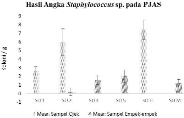 Sampel yang sudah dilakukan pengujian ditemukan hasil sebanyak 7 dari 12 sampel sesuai dengan ciri-ciri koloni Staphylococcus sp. Angka bakteri Staphylococcus sp. yang terkandung dalam pangan jajanan anak sekolah dasar di Pulau Sapeken (Gambar 5) diperoleh nilai rata-rata ± standar deviasi, diantaranya pada sampel PJAS ojek SD IT (7,4 ± 1,14) x 101 koloni / g, SD 2 (6 ± 1,58)