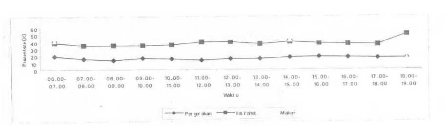 Orangutan menggunakan 84%-92% perilaku hariannya untuk melakukan perilaku pergerakan, perilaku istirahat dan perilaku makan. Perilaku makan yang tinggi sepanjang hari, dan agak menurun pada siang hari karena meningkatnya perilaku istirahat (Gambar 2). Hal ini sedikit berbeda dengan yang di Sungai Wain, yaitu perilaku makannya tinggi, perilaku istirahat sedikit dan perilaku pergerakan juga sedikit (Frederiksson, 1995). Hal tersebut berbeda dengan perilaku Orangutan liar di Ulu Segama Sabah dan Sungai Ranun Sumatra (MacKinnon, 1972), Ketambe Sumatra (Rijksen, 1978) serta Mentoko Kutai (Rodman, 1988), karena perilaku makan Orangutan banyak terjadi pada pagi dan sore hari sedangkan siang hari yang banyak dilakukan adalah perilaku istirahat. Frederiksson (1995) menduga hal tersebut terjadi karena perbedaan umur, penelitian pada Orangutan liar umumnya umurnya sudah dewasa, sedangkan penelitian pada Orangutan rehabilitan umumnya umurnya masih muda.