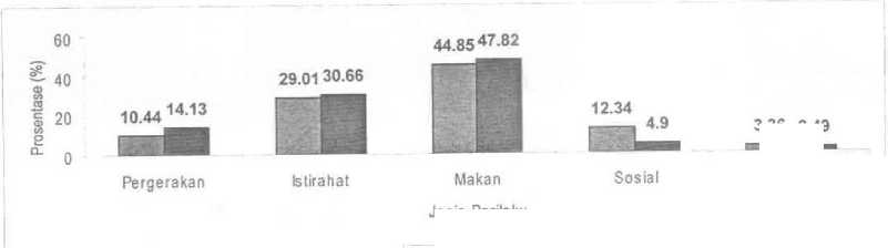 Pada penelitian ini Orangutan jantan melakukan lebih banyak perilaku pergerakan, perilaku istirahat dan perilaku makan daripada Orangutan betina (Gambar 3). Sedangkan Orangutan betina lebih banyak melakukan perilaku sosial daripada Orangutan jantan, hal ini juga terjadi pada Orangutan liar di Tanjung Puting (Galdikas, 1978). Kemungkinan hal ini terjadi karena Orangutan jantan perilaku makannya lebih banyak, sehingga perlu perilaku pergerakan banyak dan akibatnya perilaku sosialnya kurang.