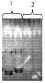 Gambar 1. Visualisasi Contoh Produk PCR (1= Produk PCR yangteramplifikasi, 2= Produk PCR yang tidak teramplifikasi.