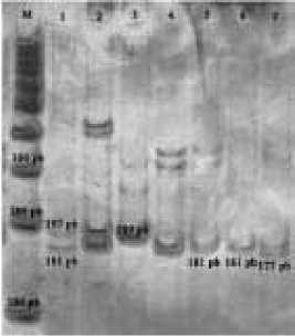 Gambar 2. Alel pada Lokus D2S1338 (M= 100 bp DNA ladder; 1 – 7= Sampel dari sub-suku Batak Toba)