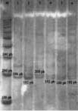 Gambar 3. Alel pada Lokus D13S317 (M = 100 bp DNA ladder; 1 – 4 = Sampel dari subsuku Batak Toba; 5 = Sampel dari Batak Simalungun; 6 = Sampel dari Batak Karo