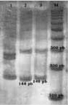 Gambar 4. Alel pada Lokus D16S539 (M= 100 bp DNA ladder; 1 dan 2= Sampel sub-suku Batak Toba; 3= Sampel sub-suku Batak Simalungun)