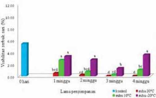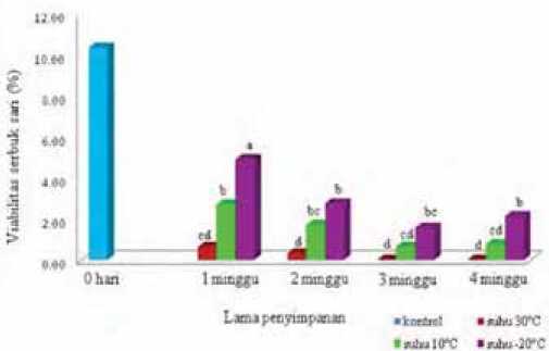Hasil ANOVA menunjukkan bahwa suhu dan lama penyimpanan berpengaruh nyata (P ≤ 0,05) terhadap viabilitas serbuk sari dan panjang buluh serbuk sari buah naga putih, merah dan super merah. Suhu rendah 10°C dan -20°C selama penyimpanan 1 sampai 4 minggu menunjukkan viabilitas dan panjang buluh serbuk sari yang lebih baik dibandingkan dengan suhu 30°C (Gambar 1, 2 dan 3). Pada suhu 30°C persentase viabilitas dan panjang buluh serbuk sari menurun setelah penyimpanan 1 minggu dan 2 minggu dan kehilangan viabilitasnya setelah 3 minggu. Persentase viabilitasnya berturut-turut yaitu 0,63%; 0,31% pada buah naga putih, 0,50%; 0,19% pada buah naga merah. Pada buah naga super merah persentase viabilitas serbuk sari pada minggu pertama adalah 0,50% dan serbuk sari kehilangan viabilitasnya pada minggu kedua.