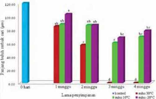 Panjang buluh serbuk sari buah naga putih, merah dan super merah setelah disimpan pada suhu 30°C selama 1 dan 2 minggu memiliki panjang buluh yang paling kecil dibandingkan suhu 10oC dan -20oC dan setelah 3 minggu serbuk sari tidak mampu membentuk buluh. Panjang buluh serbuk sari yang dibentuk berturut-turut yaitu 85,24 μm; 57,09 μm pada buah naga putih, 78,64 μm; 60,58 μm pada buah naga merah, sedangkan pada buah naga super merah serbuk sari mampu membentuk buluh setelah penyimpanan 1 minggu yaitu 83,30 μm dan tidak mampu membentuk buluh lagi setelah 2 minggu penyimpanan (Gambar 4, 5 dan 6).