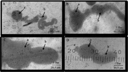 Keterangan: A. Buluh serbuk sari buah naga putih; B. Buluh serbuk sari buah naga putih; C. Buluh serbuk sari buah naga super merah; D. Buluh serbuk sari buah naga merah; a. Butir serbuk sari; b. Buluh serbuk sari