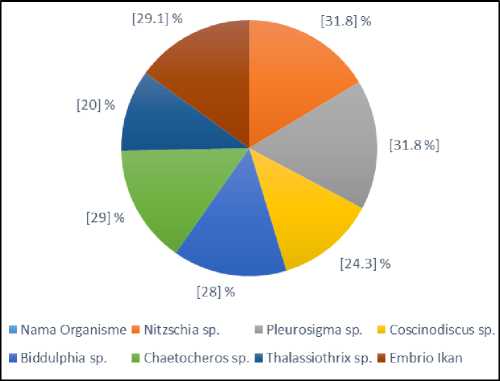 presentase nilai satu jenis makanan atau nilai Ni diperoleh jenis makanan dengan ukuran diameter yang besar pada organ pencernaan ikan gelodok yaitu spesies Coscinodiscus sp., Biddulphia sp., Pleurosigma sp. Hasil penelitian (Yanti, 2000) yang dilakukan di Perairan Ujung Pangkah, Jawa Timur menunjukkan terdapat komponen penyusun jasad makanan dari ikan gelodok yakni termasuk dalam kelompok plankton meliputi fitoplankton dan zooplankton. Berdasarkan hasil